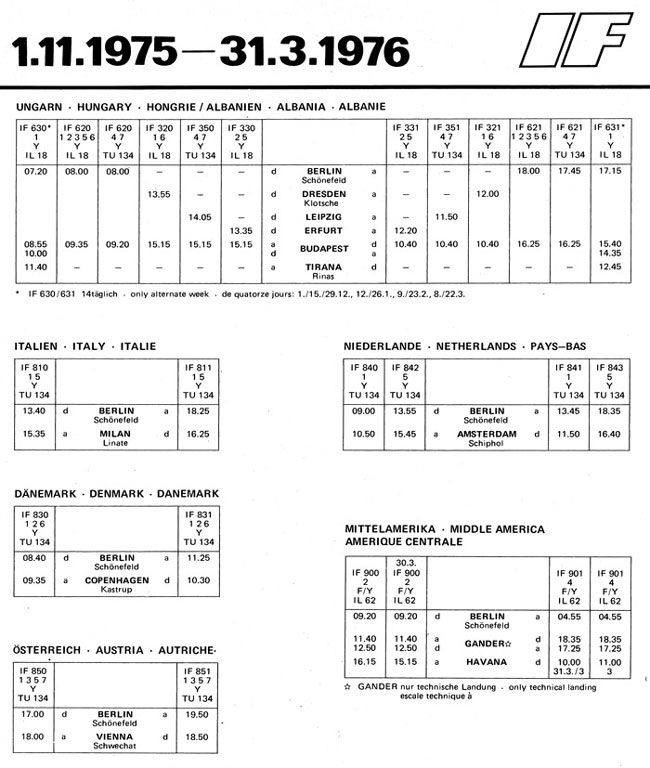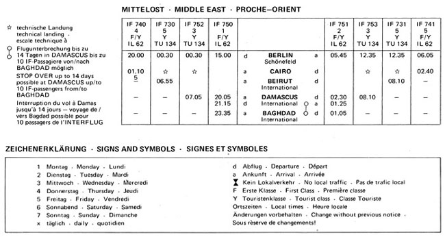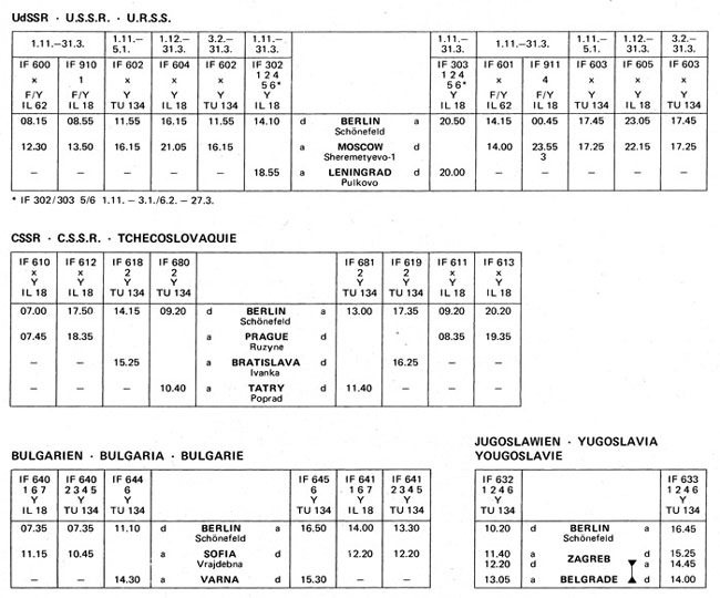 DDR - NSW (nichtsozial. Wirtschaftsgebiet) 29. 05. 1964 Berlin - Nicosia (1974 eingest.) 22. 06. 1964 Berlin - Kairo 15. 01. 1966 Berlin - Nicosia - Damaskus 27. 10. 1966 Berlin - Algier - Bamako (bis 28.03.1976) 17. 11. 1966 Berlin - Algier -Bamako-Conakry (bis 31.03.1977) 08. 01. 1967 Berlin - Nikosia - Damaskus - Bagdad 07. 07. 1978 Berlin - Beirut 03. 07. 1969 Berlin - Kairo - Karthoum (1976-78 eingest.) 26. 11. 1969 Berlin - Budapest-Algier-Freetown-Conakry(bis 31.03.77) 11. 11. 1970 Berlin - Wien 04. 04. 1972 Berlin - Kopenhagen 03. 04. 1973 Berlin - Helsinki 23. 04. 1973 Berlin - Amsderdam 01. 07. 1974 Berlin - Mailand 05. 04. 1976 Berlin - Karachi (-Hanoi) 23. 05. 1976 Berlin - Larnaca 13. 04. 1977 Berlin - Algier - Lagos - Luanda 03. 06. 1977 Berlin - Istambul 27. 02. 1978 Berlin - Algier - Tripolis 01. 11. 1978 Berlin - Kairo - Karthoum - Addis Abeba 07. 04. 1979 Berlin - Algier - Lagos - Luanda - Maputo 02. 06. 1997 Berlin - Athen 01. 04. 1980 Berlin - Stockholm - (-Helsinki) 18. 04. 1980 Berlin - Brüssel --------1980 Berlin - Dubai --------1980 Berlin - Rom 02. 04. 1985 Berlin - Malta - Tripolis 26. 06. 1987 Berlin - Peking |